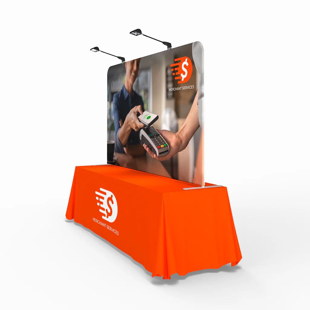 This tension fabric display is a great alternative to standard pop up back wall displays. Lightweight aluminum poles with bungee cord snap together to create the base framework, then slide on the pillowcase-like graphic over the frame and zip it closed at the bottom. The zipper is hidden from view and tightens up the stretched fabric graphic for a smooth image. Single or Double-sided.